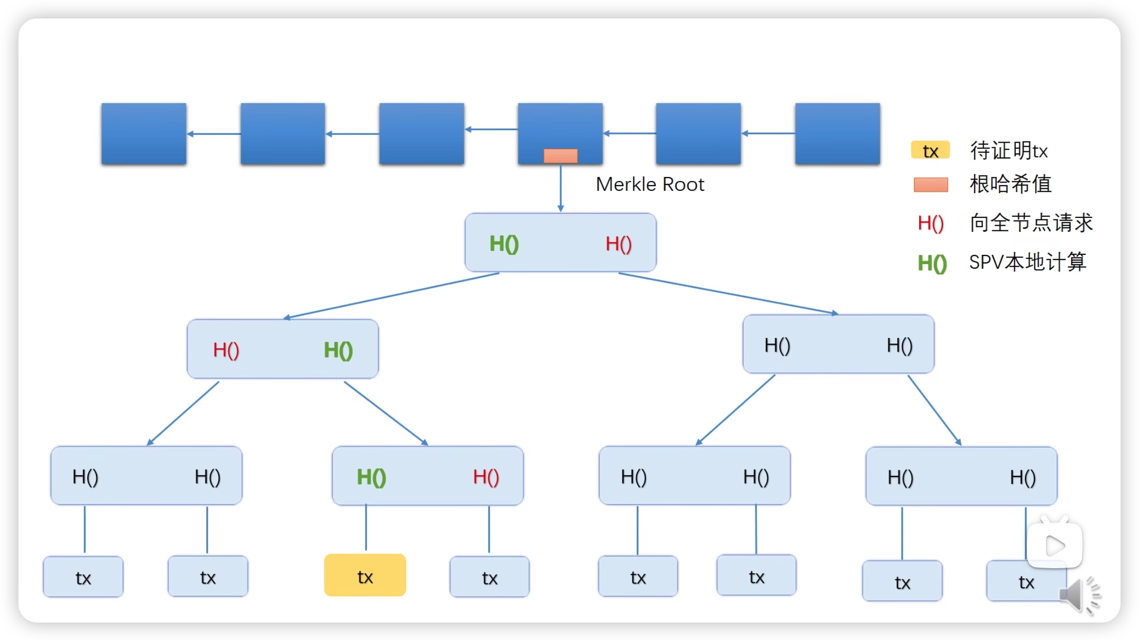 如果一个轻节点用户(例如手机钱包用户)想要确认“我收到的这笔交易(黄色 tx)”是否真的被打包进了某个区块中,但他手中没有完整的交易数据,该怎么办?这就需要用到 Merkle Proof。