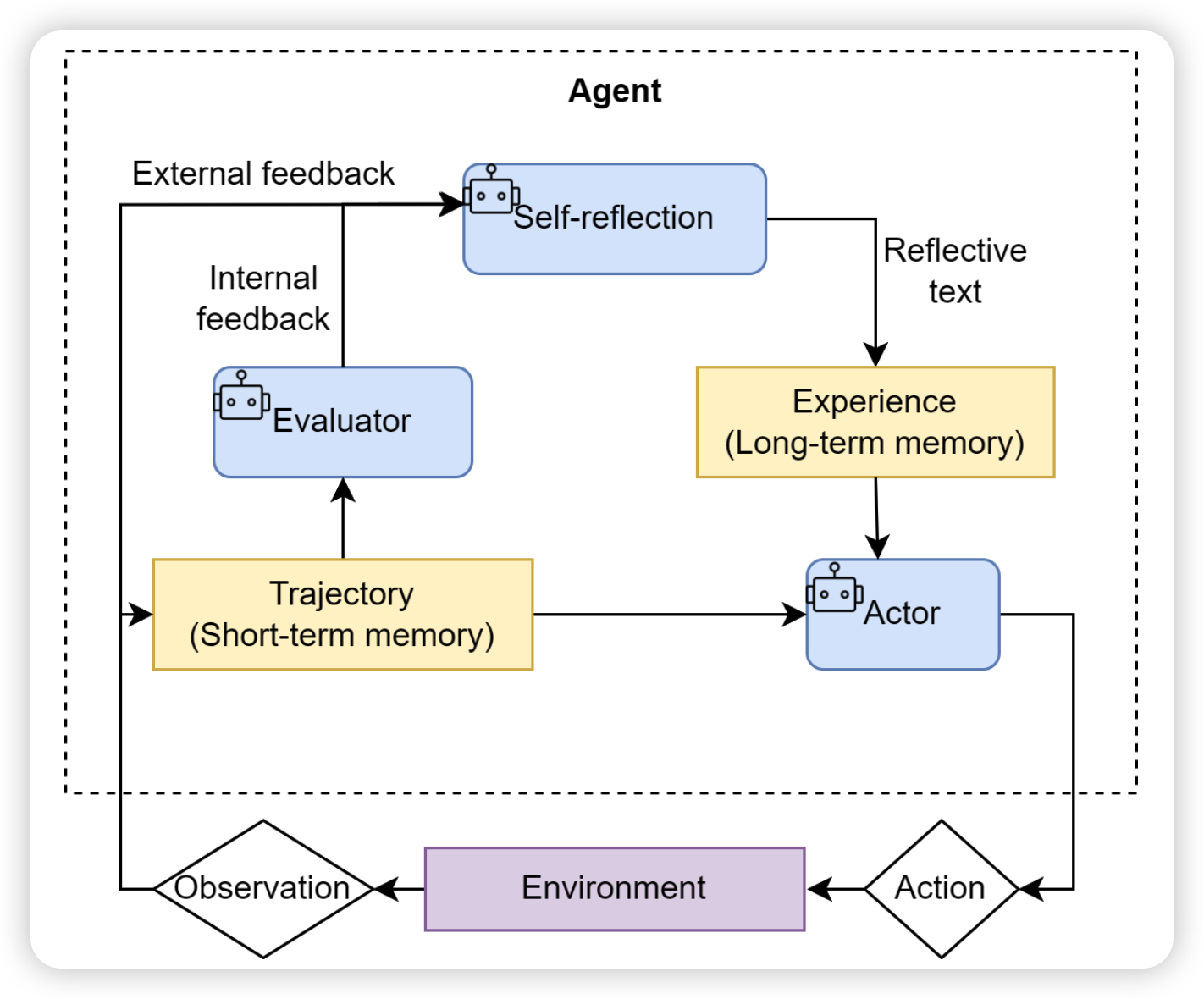 这张架构图详细展示了带有反思机制的智能体(Agent)是如何在环境中完整运作的。它的核心是一个不断循环并且自我优化的系统,主要包含以下几个关键模块: